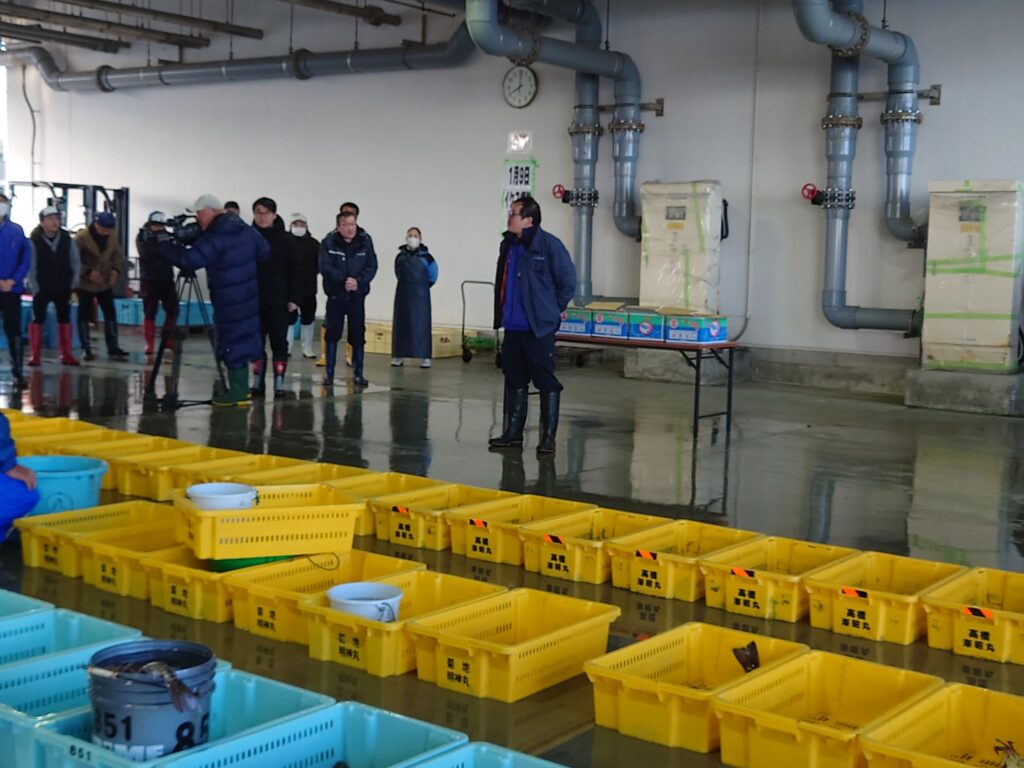 本日が初セリとなります。組合長挨拶などのセレモニーを行いました。