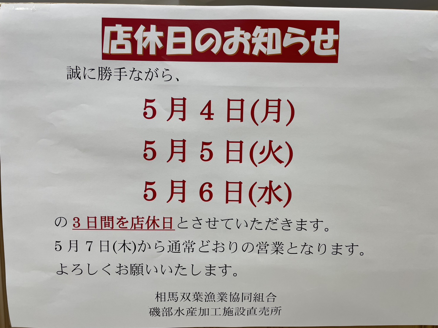 (2026/04/24)直売所休業日のお知らせ